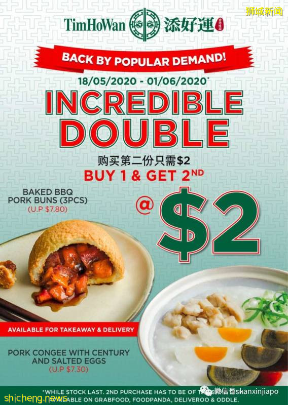 添好运猪肉包,猪肉皮蛋咸蛋粥有促销,购买第二份只需2新币。