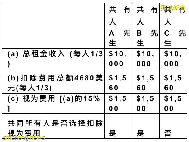 如果财产是共有的,每个共有人都可以选择从他/她的租金收入中扣除视为的费用或实际发生的费用。换句话说,没有要求所有共有人都选择相同的处理。