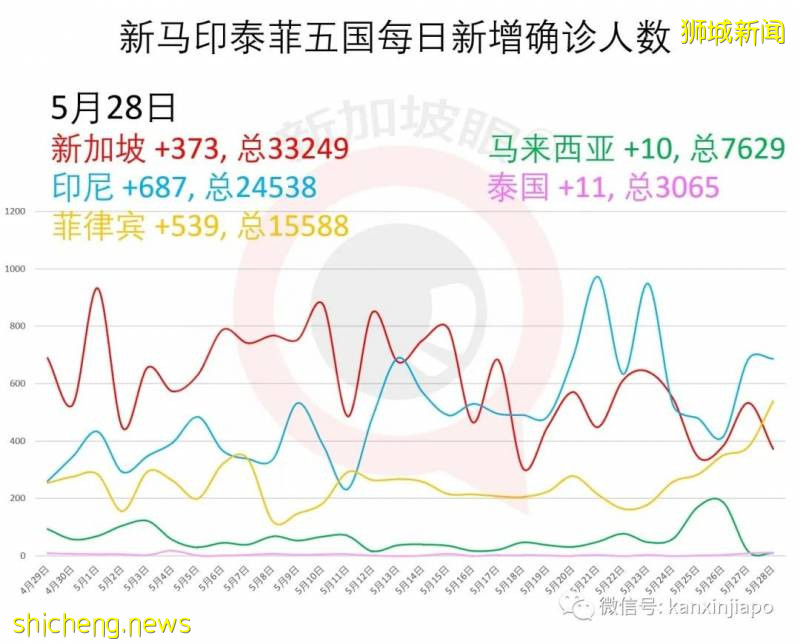 5月28日,印尼新增687例(累计24538例);菲律宾新增539例(累计15588例),为单日最高增幅;马来西亚新增10例(累计7629例);泰国新增11例(累计3065例),全为海外归国人员,其中5人为按摩师,1人为家庭佣人,4人为建筑工人。