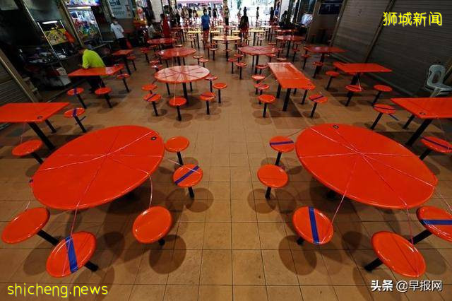 新加坡小贩中心目前不允许堂食。这座小贩中心昨天被发现用绳子将桌椅封住,以免有人坐下用餐。(叶振忠摄)