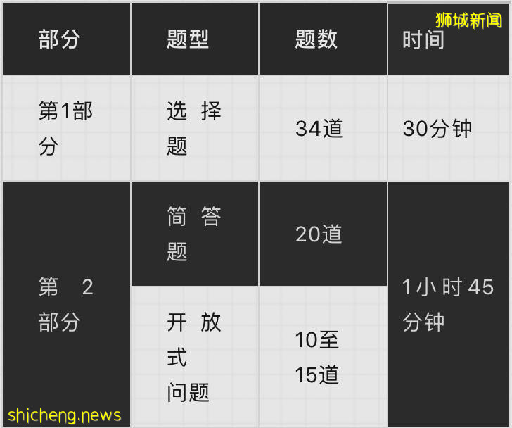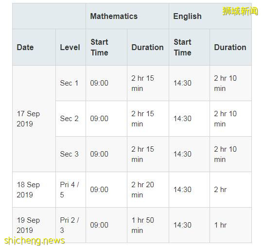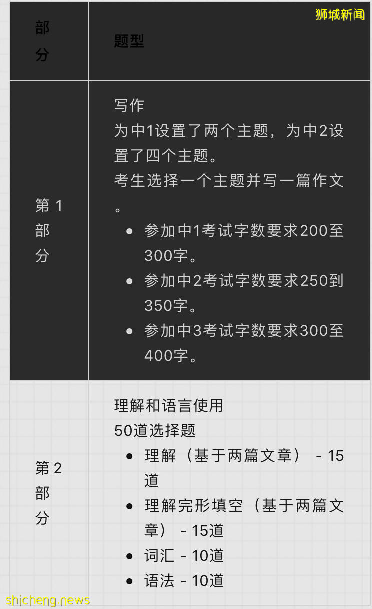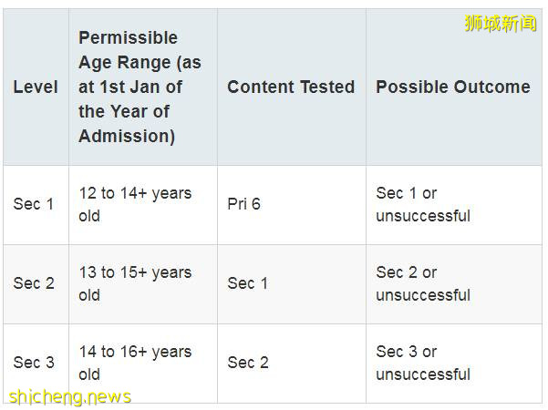分为三个级别的考试,即中学1年级(Sec1)、中学2年级(Sec2)和中学3年级(Sec3)。
