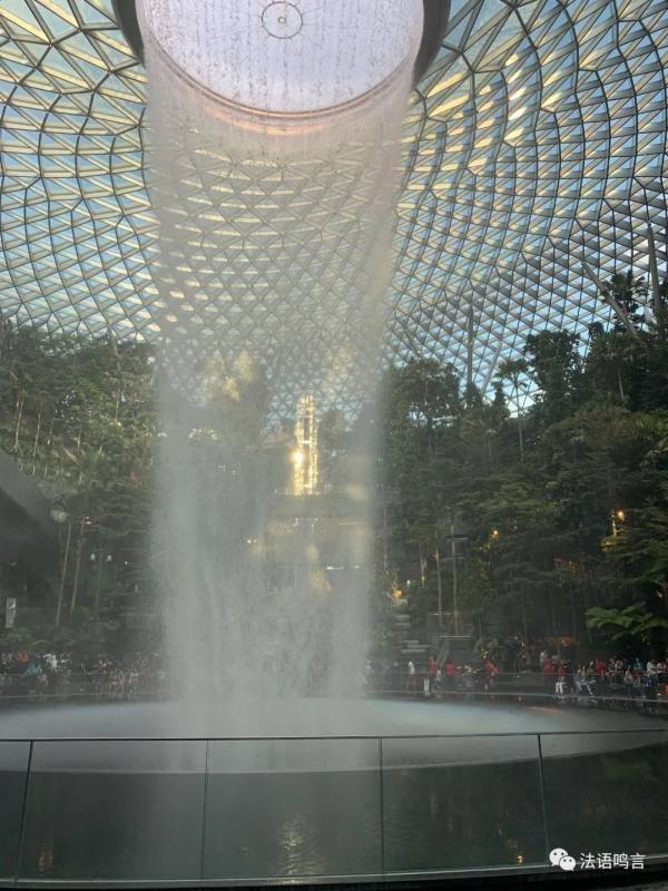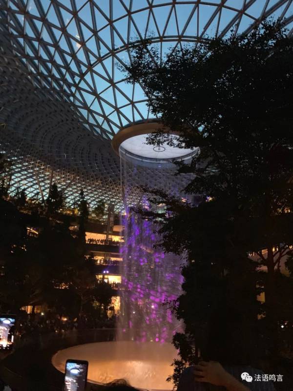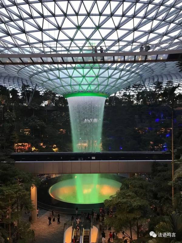 我们乘坐地铁来到机场后,简直如同购物天堂一般,这哪是机场啊,明明是商场。令我们更加震惊的,远远不止这些。当我们乘坐轻轨列车前往T3航站楼时,在途中看见一座巨大的喷泉,大约有几十米高,围成一座大圆,周围全是绿树,仿佛置身于热带雨林。周围围满了人在此拍照。夜晚,闪著灯光的喷泉更加美丽,五彩缤纷,美轮美奂,有轻轨列车途中经过,如同童话世界一般美妙。