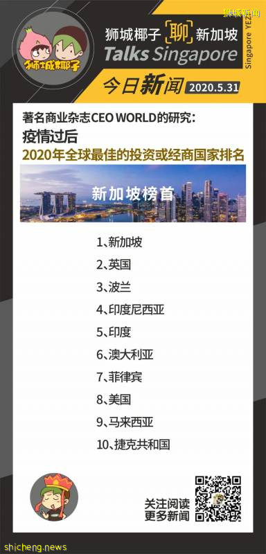 根据著名商业杂志CEO WORLD,疫情过后,2020年全球最佳的投资或经商国家排名 新加坡排名第一!