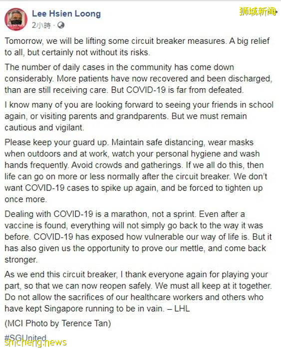 (新加坡1日讯)新加坡总理李显龙李显龙指出,尽管明天起阻断措施逐步解封,但解封后仍有一定风险,促请国人继续保持警惕。