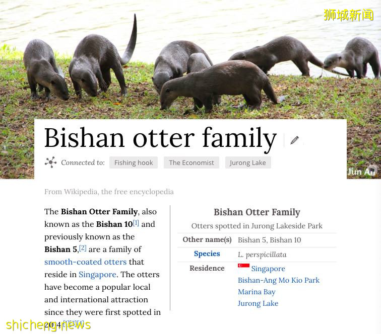 碧山家族甚至有自己的维基百科词条 早在2013年,碧山家族就已经在新加坡河流域占山为王,成为一带地头獭,独享辖区里的渔业资源。后来,一对籍贯不明的陌生水獭也相中了这块风水宝地,在滨海湾金沙酒店附近安置爱巢,还生了5只幼崽,江湖人称滨海湾家族。