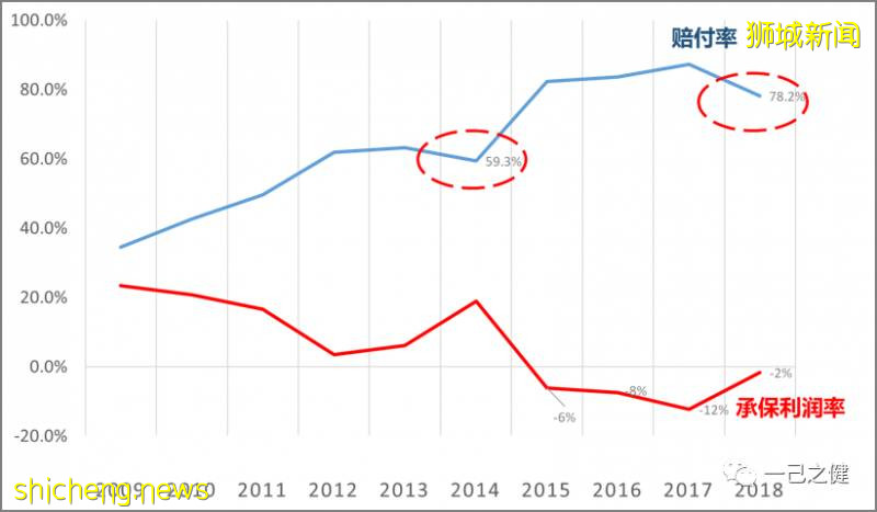 另外这一系列费率调整的背后其实隐藏着行业赔付率上升的事实,2009-2018十年间,行业赔付率**在商业医疗保险费率调整的情况下依然从34.5%一路飙升至78.2%。如图8所示,2013年和2017年的大幅度调费对于续年的业务赔付率确实起到了正面的影响,但由于医疗成本的持续恶化,赔付率还是在继续走高,而同时承保利润率***则逐年降低,直至持续亏损。图8. 2009 – 2018新加坡长期医疗险全行业整体赔付率和承保利润率