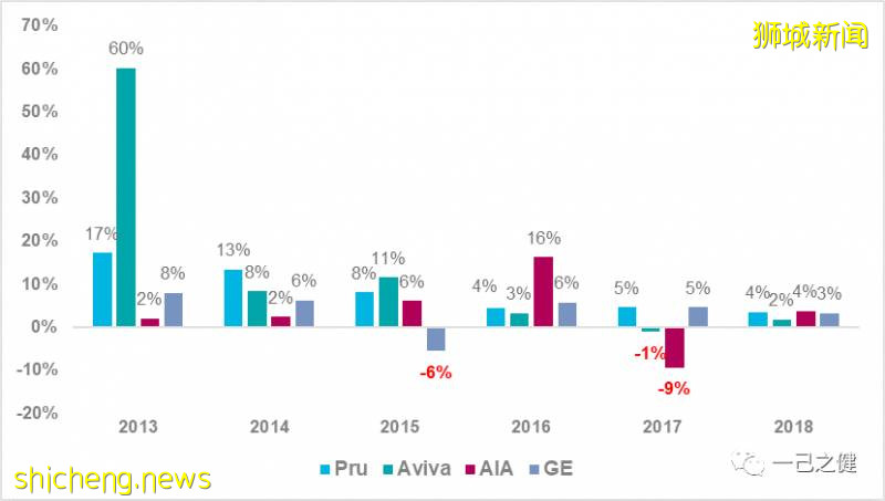 1)新加坡保险公司调费往往是一个行业范围的,即各家保险公司会在某一段时间内集中调费,如果没有费率上明显的差异,投保人因为调费而转保的意愿不强烈;2)如上面所分析,新加坡的医疗费用还是很贵的,商业医疗保险几乎成了刚需,经过多年的市场教育,投保人对于调费已经司空见惯,对于调费的敏感度不高;3)转保需要放弃现有保单对于“既往症”的保障,而转保另外一家公司产品又需要重新核保,有可能会被拒保、除外甚至额外加费,往往得不偿失;4)新加坡经营长期医疗保险的公司数量相对较少,并非一个完全竞争的市场,保险公司之间不会用恶性竞争的方式争夺客户资源;5)各家保险公司的商业医疗保险保障责任大同小异,留住客户的关键法宝是服务创新和“承担过往既往症”。下图通过官方数据展示隔年保单数量增长情况,除2015和2017年出现部分负增长之外,其余年度保单数量均为正增长。图7. 2013 – 2018 四家保险公司保单量增速