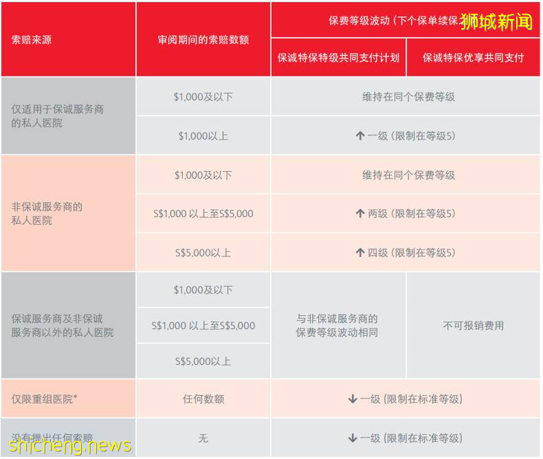 如果理赔发生在网络外指定私立医院,且理赔金额在1000新币及以下续保可维持费率不变,1000新币至5000新币时续保费率需要上升两个等级,而理赔金额达到5000新币以上时需要提升四个等级。