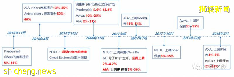 *注:由于National Trades Union Congress (NTUC)是一家国企在2015年(+23%),2016年(+34%)出现了较大幅度涨幅,在2018年(-37%)又出现了较大幅度降费,猜测该公司在产品结构可能有较大调整;另外,NTUC在过去十几年一直保持着较高比例的再保安排,该公司在2015-2017期间的长期医疗保险亏损主要源自再保安排,而再保安排往往涉及商业机密不会具体披露,具体原因是由于前期签订的长期再保合同致使其发生再保损还是一个长期的财务再改变了其利润曲线就不得而知。考虑到NTUC这家公司财务报表的异常性,本文的分析暂时将其移除。为了缓解商业医疗保险的调费压力,提高长期医疗保险保费的可持续性和可支付性,新加坡政府决定自2015年开始扩大基本健保(MediShield)的保障范围(包括在B1级别以上病房的报销比例),即现在的终身健保(MediShield Life),本次调整预计可以分别节约商业保险B1/A计划和私立医院计划14%和6%的理赔支出。但在2015年6月份,新加坡政府与保险公司同时协商确定了一个一年期的商业保险费率冻结期,即从2015年11月份开始实施,冻结期内IP产品的费率不做调整,但医疗附加险产品的费率不受此限。因此自2015年11月开始至2018年3月,保险公司开始了多轮的费率调整:图5. 2015年11月以后新加坡长期医疗保险的费率调整行动