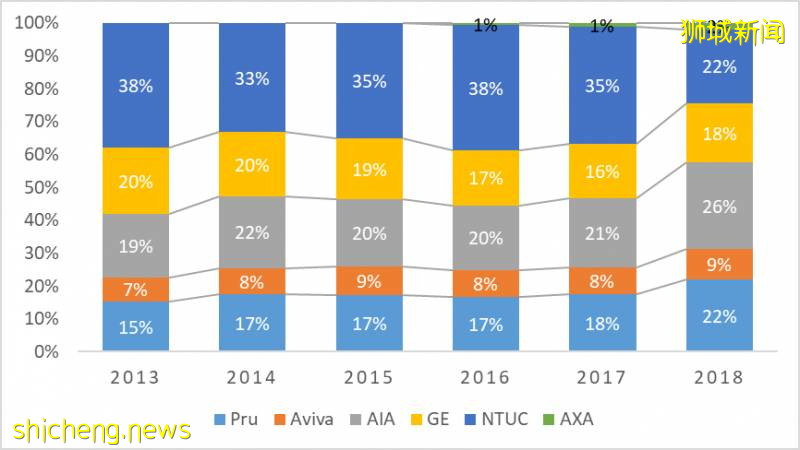 新加坡长期商业医疗保险的行业概况在新加坡想经营长期商业医疗保险可不是过家家,想玩儿就玩儿,想撤就撤的,保险公司需要获得政府批准,方可进入长期商业医疗保险。截止到2020年共有7家保险公司获批经营,其中Raffles Health于2019年才进入市场。2013-2018年间市场竞争也可谓非常之激烈,但除了NTUC这家国企的份额被挤掉一部分外,其他保险公司份额基本稳中略升(具体如图1)。AXA从2016年开始才进入长期医疗险市场,到2018年的市场份额依然很小。NTUC开始长期医疗险时间较早,但因为其市场服务创新能力相对较弱,其市场份额从2013年的38%逐渐下滑到了2018年的22%。图1. 新加坡长期医疗保险(主险及附加险)的市场份额