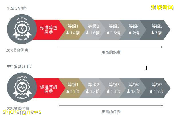 Rider的续保保费可分6个等级,标准等级以及等级1~5。对于55岁以下的被保险人,续保保费最多可增至标准保费水平的3倍(即第5级费率);对于55岁以上的被保险人,最高等级的倍数为1.5倍。