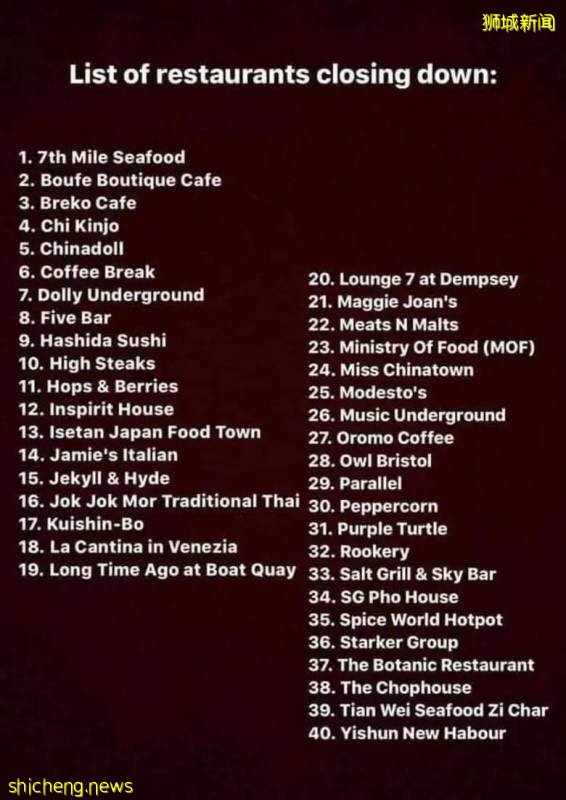 至于结业的餐饮公司以哪个类别居多,统计局并没有详细说明。不过最近新加坡社交媒体流传一份名单,列出40家已经或即将结束营业的餐馆: