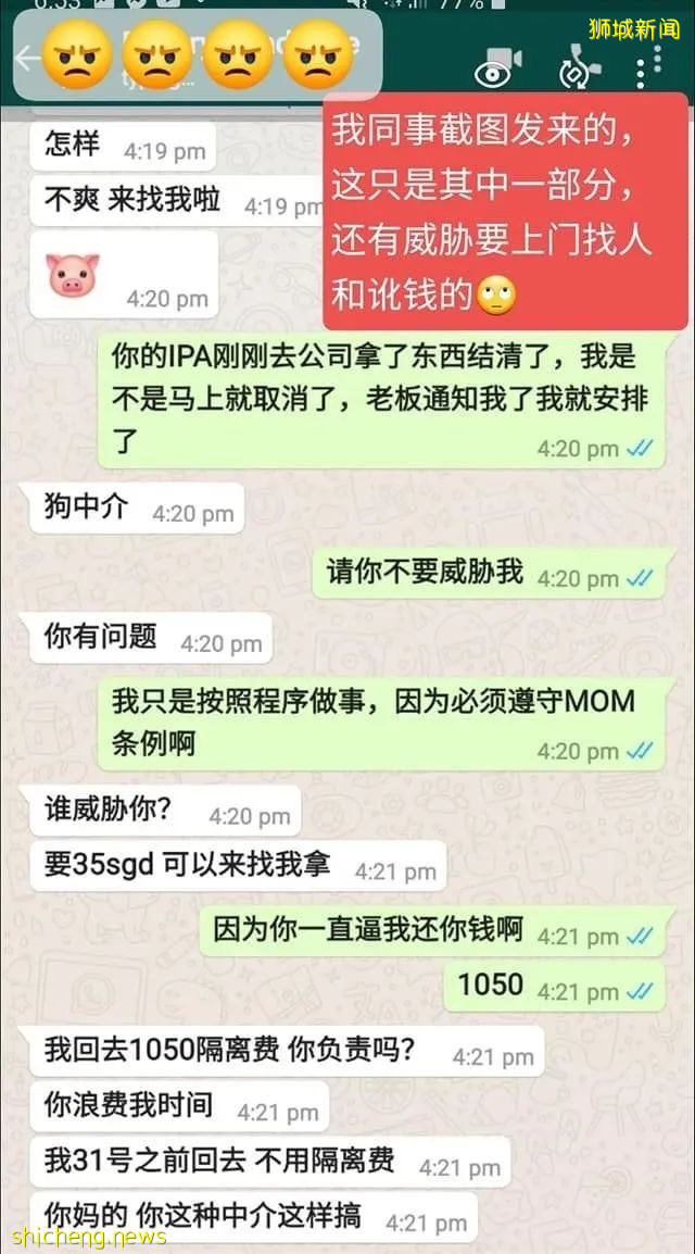 厉害没见过这样讹钱的。6月1号凌晨发信息告诉我们他不要做,都没有真的开工,还要讨钱。我们没有收他中介费也没有合约,还一直为了他的事情各种忙,看我们好说话就欺负我同事,各种威胁和辱骂。做中介太难了!他仗着自己在新加坡工作多年,觉得自己很很懂就威胁和讹钱,所以我们也已经声明如果他乱来一定走法律程序,现在他态度还是嚣张。