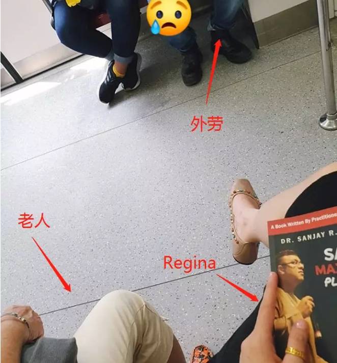 这名印度族客工看起来像是建筑工人。他原本坐在地铁上的“优先座位”上,但旁边的位置是没人坐的。后来一位老人上了地铁,老人与这名客工对视,似乎是不愿意坐到客工身边。