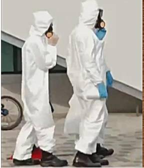 这时,三男子穿着白色防毒服饰,三人都是全副武装,脸上戴着防毒面罩,双手套上蓝色手套。