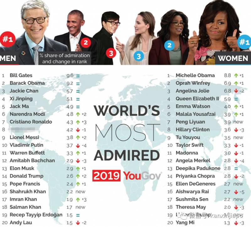 排在榜单中第1位的是美国前总统奥巴马,没想到奥巴马卸任这么多年,还是那么受人欣赏~(现任特朗普尴尬了啊......)