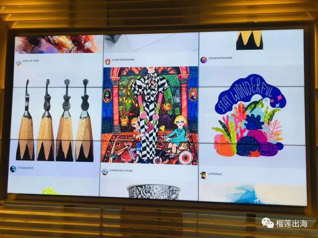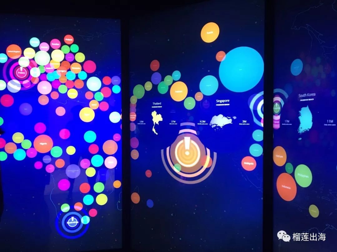 这面互动墙展示了各个市场的Facebook Reach。比如新加坡的日活用户为300万,月活用户430万。