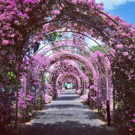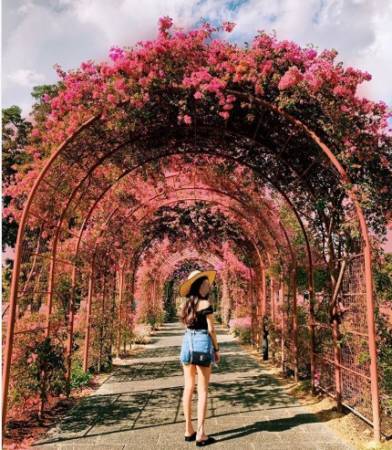 最近夏日炎炎,正好是九重葛万紫千红绽放时节,墓园的拱门花团锦簇,吸引了不少人在湛蓝天色下自拍美照。
