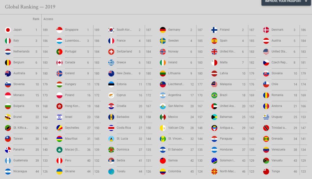 2019世界最具含金量护照排行据国际航空运输协会(International Air Transport Association,缩写为IATA)的Henley Passport Index显示,并列排名第一的是日本和新加坡,这些国家的护照持有人可以免签进入189个国家,韩国与德国并列排名第二,可以免签进入187个国家。