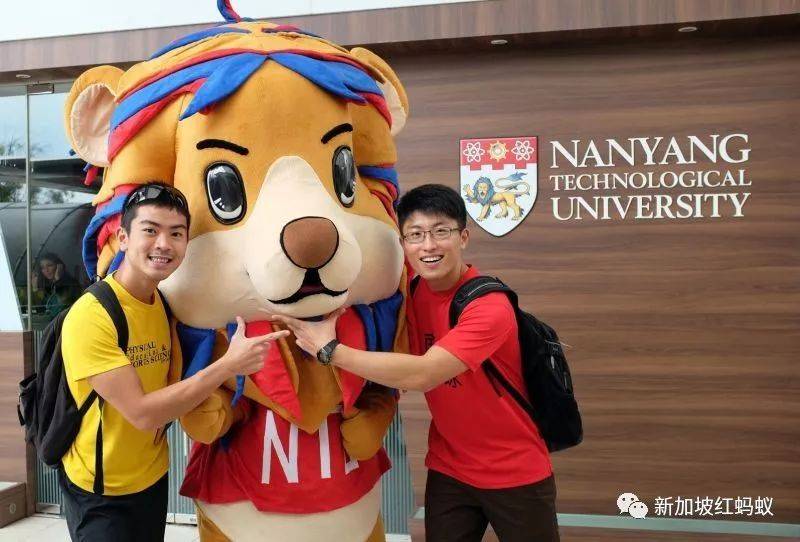 南洋理工大学学生与吉祥物合照。(南洋理工大学面簿)