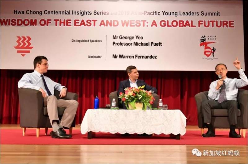 杨荣文(右)指香港终究难逃北京的手掌心。左为美国哈佛大学中国历史教授普鸣和对话会主持人《海峡时报》总编辑华仁·费南德斯。(华侨中学)