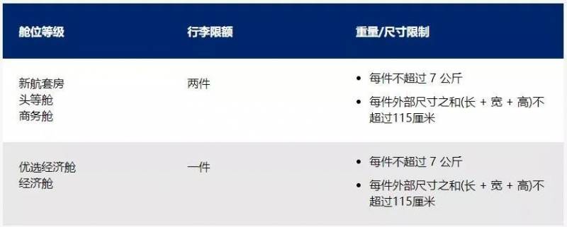 搭乘新航及胜安经济舱或优选经济舱的乘客,可以携带1件随身行李;搭乘商务舱、头等舱或新航套房的乘客,最多可以携带2件随身行李。每件随身行李不超过7公斤。