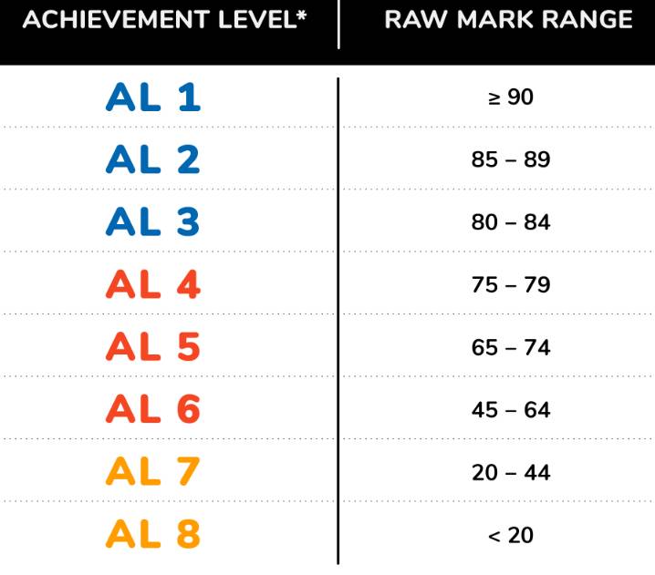 普通水平科目的成绩分为AL1到AL8八个等级。基础水平科目的成绩则按AL A、B和C来计算成绩。