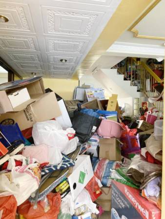据观察,垃圾屋内的杂物包括塑胶桶、地毯以及形形色色的纸皮箱至少上百个。这些纸皮箱等杂物已堆积到天花板的高度。