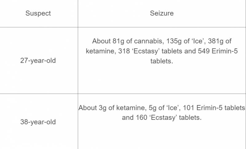 在对这4名被捕男子住处进行搜查时,警方还在一人住所缴获81克大麻、135克冰毒、381克氯胺酮(俗称K粉)以及318颗摇头丸和549片埃利敏(音译)5号;一人住所中缴获3克氯胺酮、5克冰毒、101片埃利敏和160颗摇头丸。