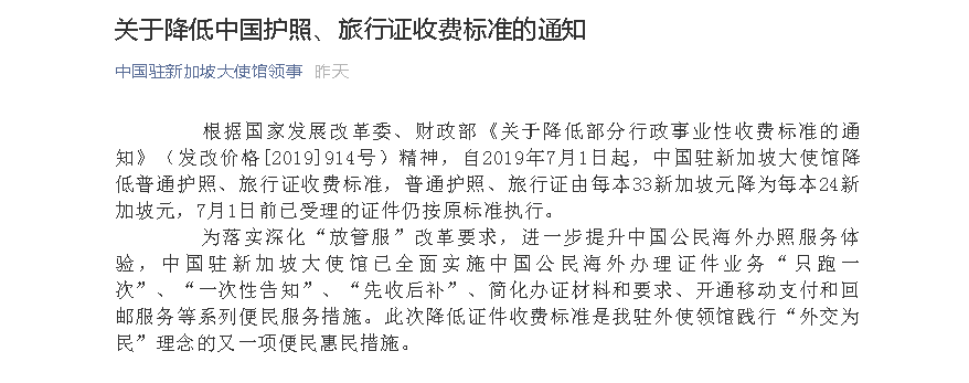 “根据国家发展改革委、财政部《关于降低部分行政事业性收费标准的通知》(发改价格[2019]914号)精神,自2019年7月1日起,中国驻新加坡大使馆降低普通护照、旅行证收费标准,普通护照、旅行证由每本33新加坡元降为每本24新加坡元,7月1日前已受理的证件仍按原标准执行。