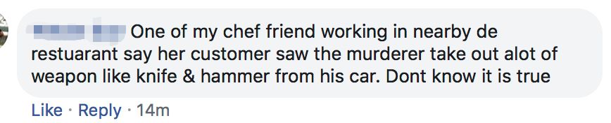 有网友称,“我一个在附近工作的厨师朋友说,她的顾客看到凶手,从车里拿出刀和锤子等凶器。不确定这是不是真的”。