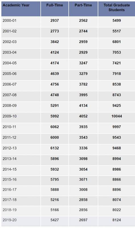 下图表示了历年的全职研究生和兼职研究生人数。2009-2010学年的招生人数为历史最高峰。