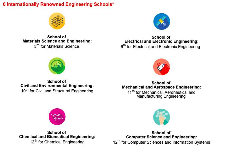 南洋理工大学的工程学院是全球最大的工程学院之一,分六个学系专注于创新和科技。学院提供多学科的综合性和专业课程,充分照顾到不同学生的学习兴趣及职业目标。除了12个学士学位课程外,还设有双学士学位课程、双主修课程、综合课程以及新加坡唯一的宇航工程课程等。