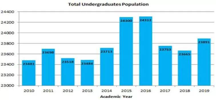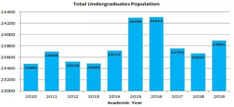 2015和2016年期间的本科招生人数为近十年最高峰,分别高达24300和24312人。而2019年的本科招生人数为23891人。