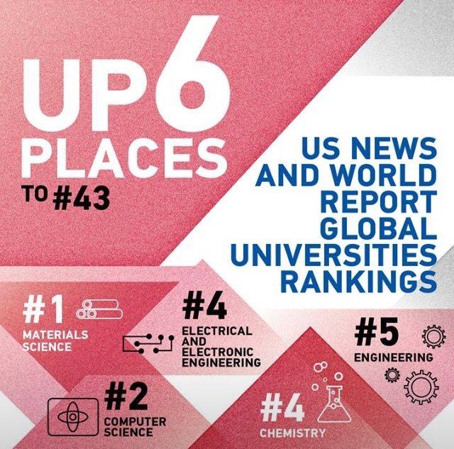 NTU在今年最新的US news世界大学排名中,NTU延续往年的势头,继续前进6名,排名第43位,并有5门学科排进前五。同时,在亚洲大学的排名中也排在第3位。