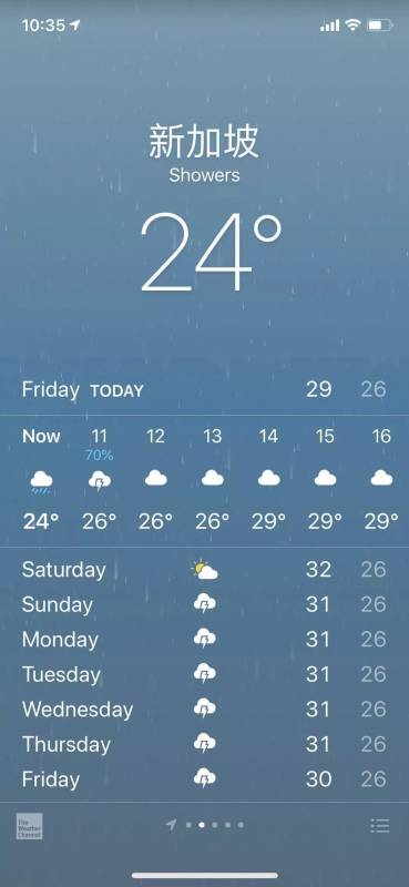 新加坡目前已经进入雨季,未来的一周也会持续降雨,最低温度可能会达到23摄氏度,甚至更低!