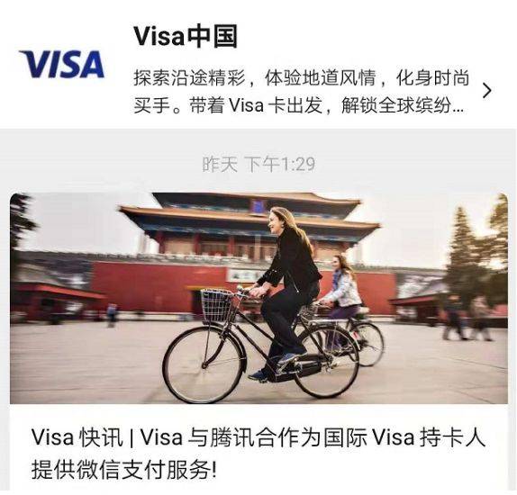 我们的合作意味着海外 Visa 持卡人在中国内地将能够在成千上万的可以受理微信支付的商户使用他们的Visa卡,而不再依赖现金。”