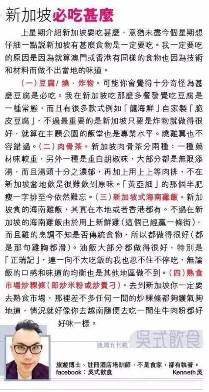 上星期介绍新加坡要吃什么,意犹未尽今个星期想仔细一点说新加坡有什么食物是一定要吃。笔者一定要吃的原因是因为就算澳门或香港有同样的食物也因为技术和材料而做不出当地的味道。