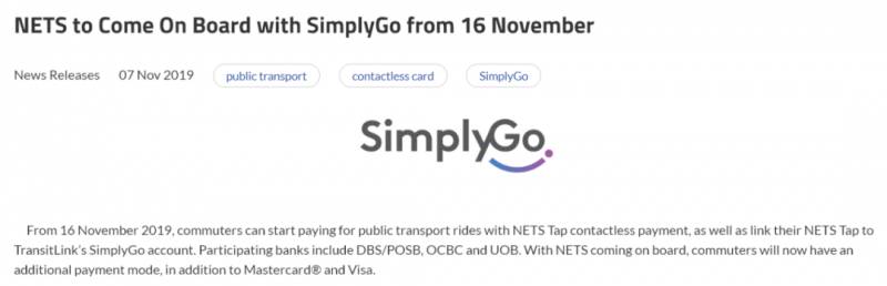 新加坡陆交局(简称LTA)公布了关于这项新付款方式的消息,并称NETS Tap的服务将加入到Simply Go计划之中(一种支持小额无现金支付的计划)。