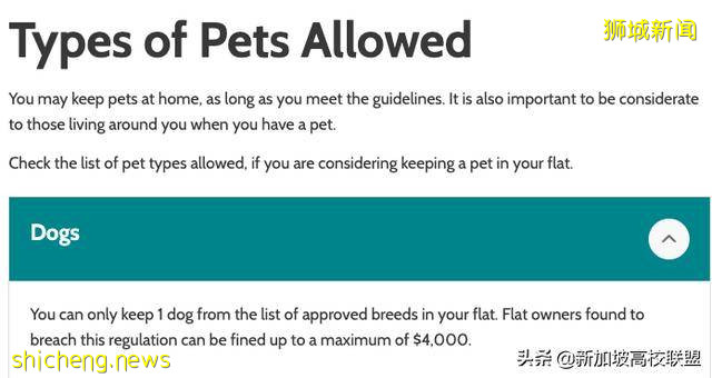 有关狗狗的种类,HDB也做了非常严格的规定。新加坡农粮兽医局规定,宠物狗的身高必须小于40厘米(含),体重低于10公斤(含),而且狗的品种必须包括在建屋发展局批准的名录内(共62种)。具体的种类可以上网查询,但大体上都是小型犬。