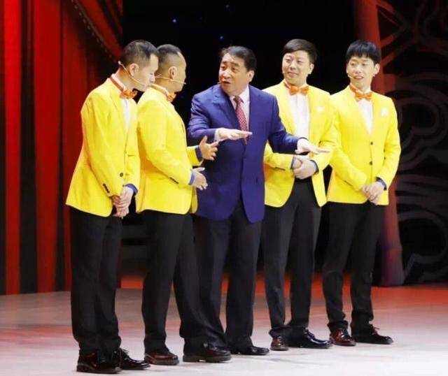 姜昆戴志诚两位老艺术家,带着四位青年相声演员在台上说相声。