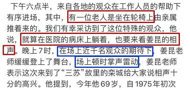 据报道,《姜昆“说”相声》石家庄站的演出,观众近千人。其中有一位老人是坐着轮椅来的。这位老人表示:就算在医院病床上躺着,也要来看姜昆的相声。
