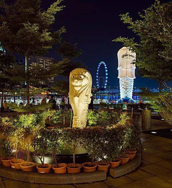 鱼尾狮的左前方远处矗立著世界第一、总高度达到165米的飞行者摩天轮。