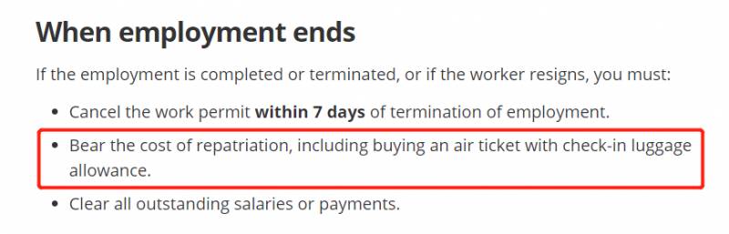 对于外籍雇员,MOM规定,如果合约完成或终止或者工人辞职,雇主必须:
