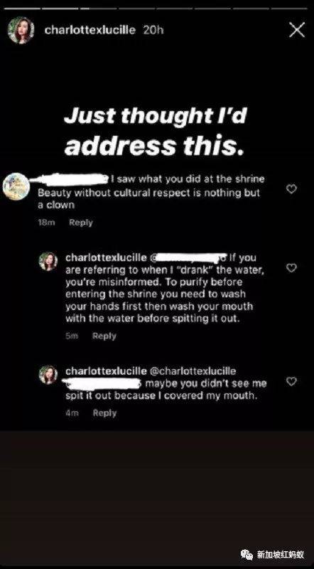 对此,狮城美姐在Instagram的限时动态淡定回应澄清说:“如果你指的是我‘喝水’一事的话,可能你误会了。进入神社前,是得先洗手,再清洗嘴巴,然后把水吐出来。”