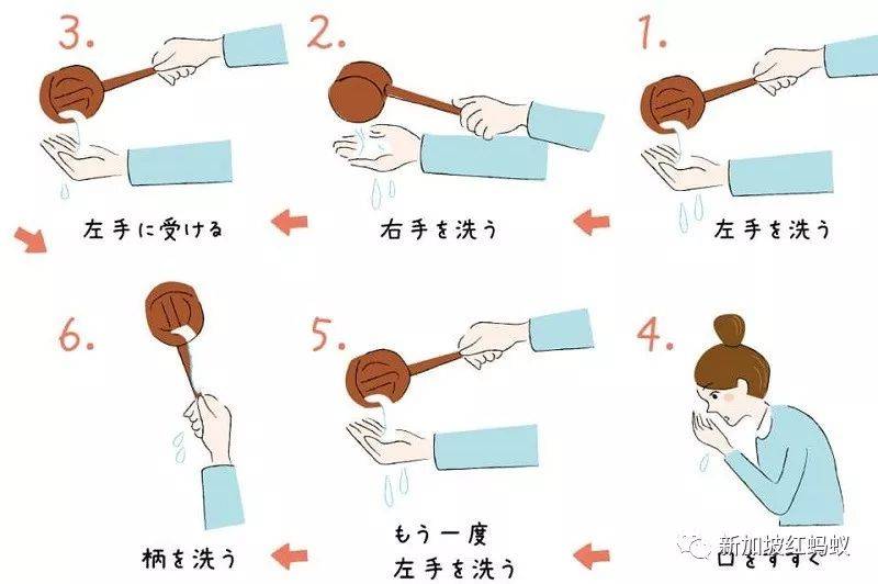 4)漱口后,再清洗左手。完成后,将勺子竖立起(倒立),令剩余的水从勺柄流走(目的是洗勺柄),再把勺放回原位。