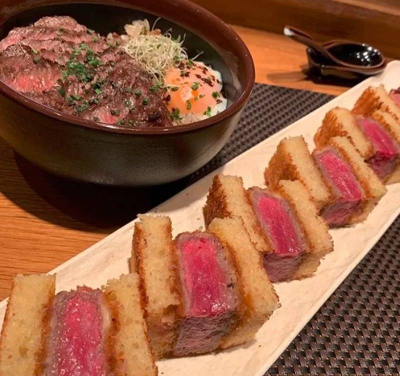 创新菜牛肉三明治,绝对在这里才吃的到。你会惊讶于和牛的大理石花纹,和牛的品质没话说,稍微将和牛制成katsu并撒上特殊的酱汁,然后将其夹在两片微焦的白面包之间,充分感觉其多汁的质地和酱汁的混合。