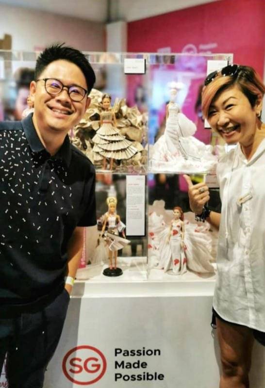 杨建(左)利用新加坡元素,设计出具有新加坡特色的芭比娃娃时装。(受访者提供)