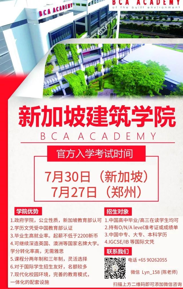 新加坡建筑学院(BCA Academy of the Built Environment)是隶属新加坡建设局的教学及科研机构,也是一所政府资助于支持,开办课程的公立院校。学院成立于 1984 年,其主要办学宗旨是为蓬勃发展的建筑业培养训练有素的建筑及设计方面人才,现2019年面向中国大陆地区招生,郑州地区50个名额,2019年应届高考生均可参加。