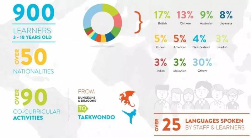 学校有来自50多个国家的学生,生源主要来自英国(占19%),美国与韩国,也有来自澳大利亚、欧洲各国、日本、印度和中国,其中中国学生占14%左右。